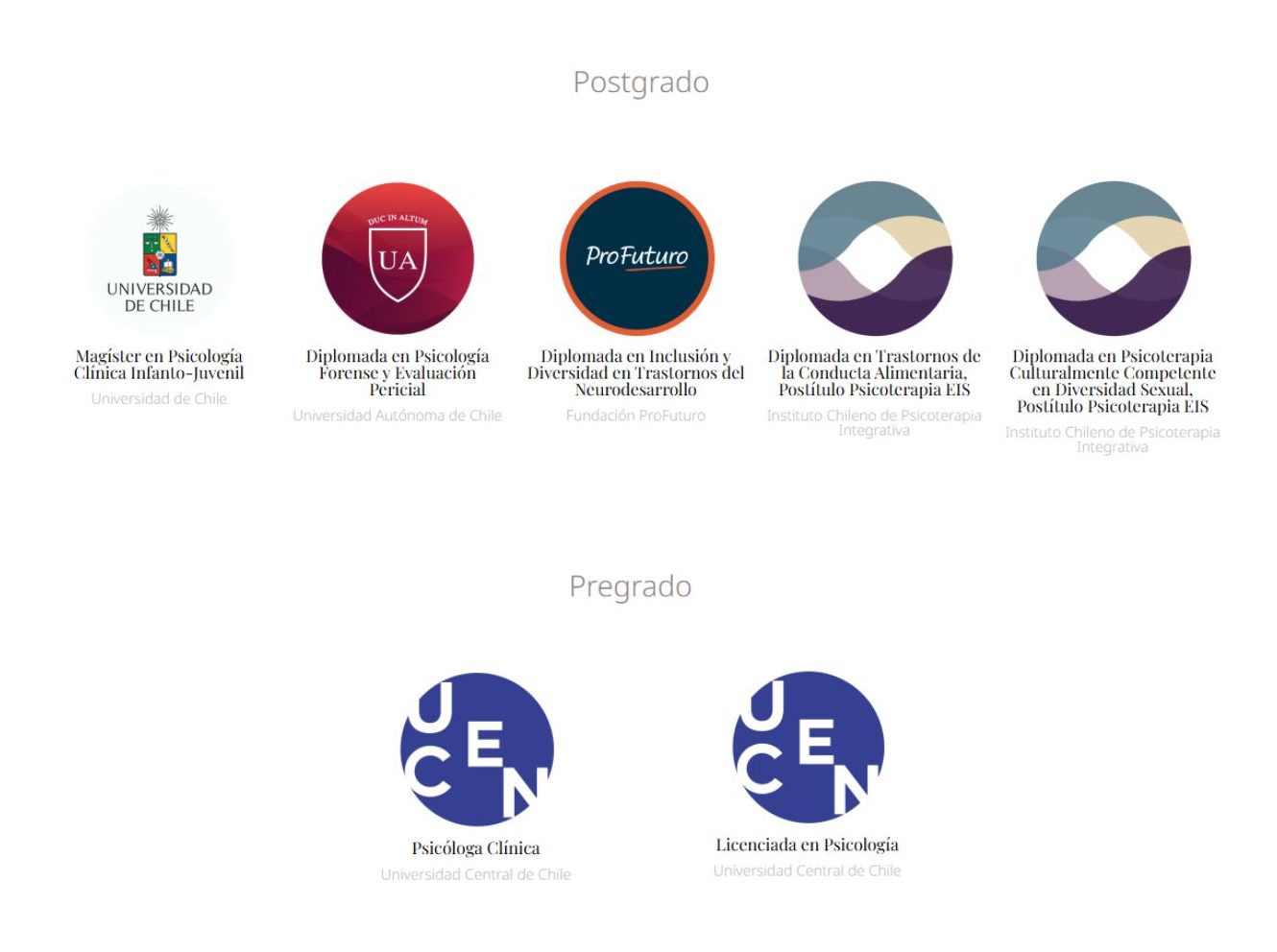 Psicóloga Clínica y Magíster en Psicología Clínica Infanto-Juvenil. Diplomada en Psicología Forense y Evaluación Pericial. Diplomada en Inclusión y Diversidad en Trastornos del Neurodesarrollo. Diplomada en Psicoterapia Culturalmente competente en Diversidad de Género y Sexualidad. Diplomada en Trastornos de la Conducta Alimentaria. Miembro de la Asociación Chilena de Estrés Traumático (ACET). Miembro de profesionales de la salud con capacitación y sensibilidad en disidencias sexuales avalado por el Colegio Médico de Chile.